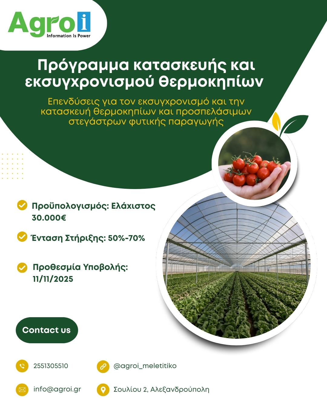 Πρόγραμμα: Π3-73-2.9 Επενδύσεις για τον εκσυγχρονισμό και την κατασκευή θερμοκηπίων και προσπελάσιμων στεγάστρων φυτικής παραγωγής
